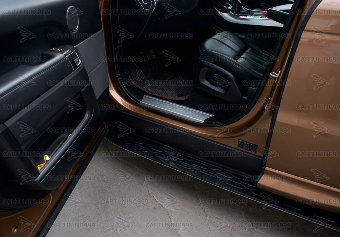 Пороги для внедорожников Range Rover Sport c 2014 года выпуска по настоящее время. Поверхность порога выполнена из противоскользящего пластика и торцевых накладок из нержавеющей стали, каркас порога и кронштейны стальные. Пороги используются для удобной посадки-высадки, защищают штатные пороги внедорожника от грязи. Являются неотъемлемым аксессуаром для тюнинга автомобиля, придадут Вашему внедорожнику индивидуальность и элегантный внешний вид.