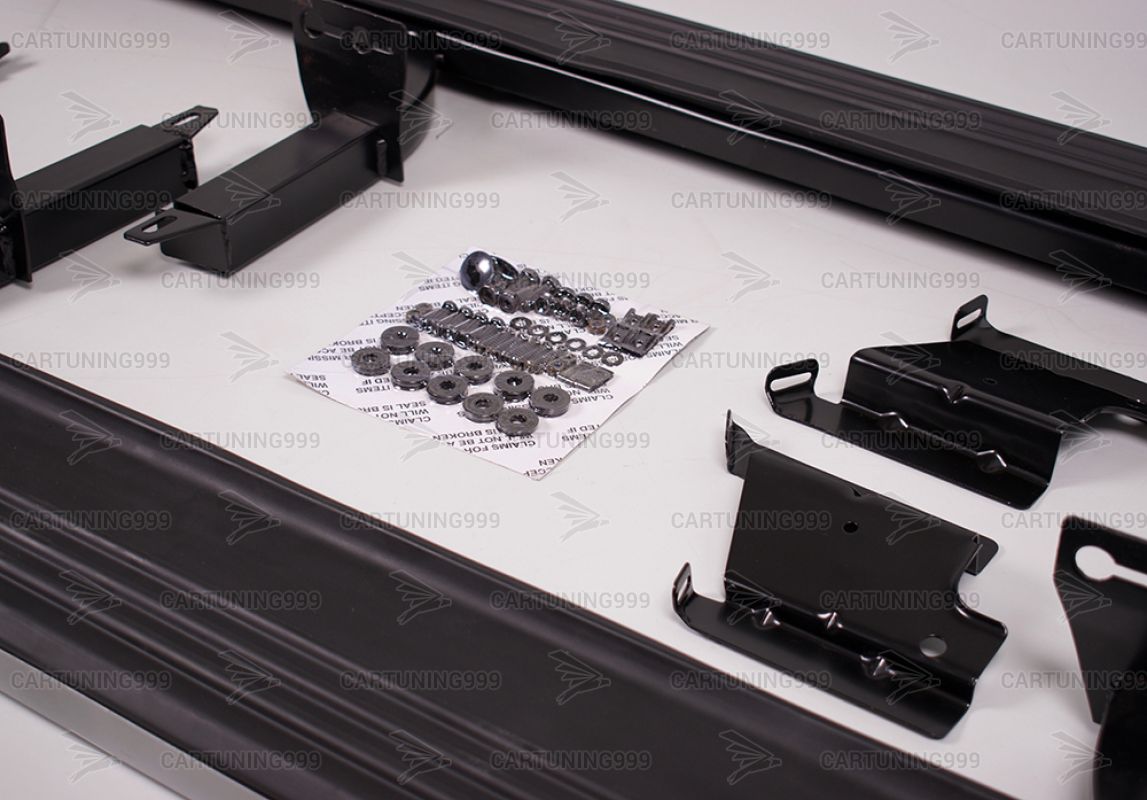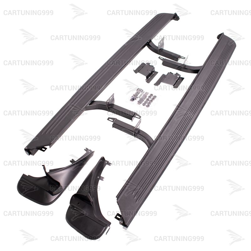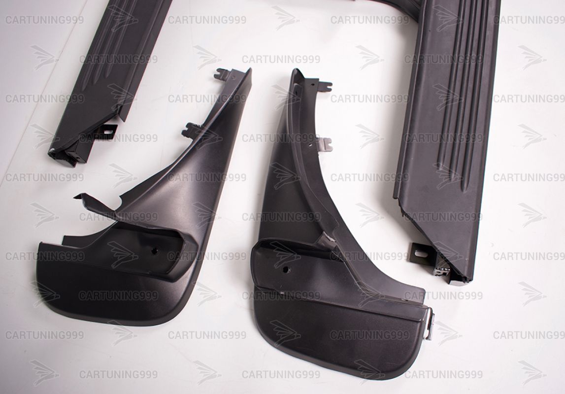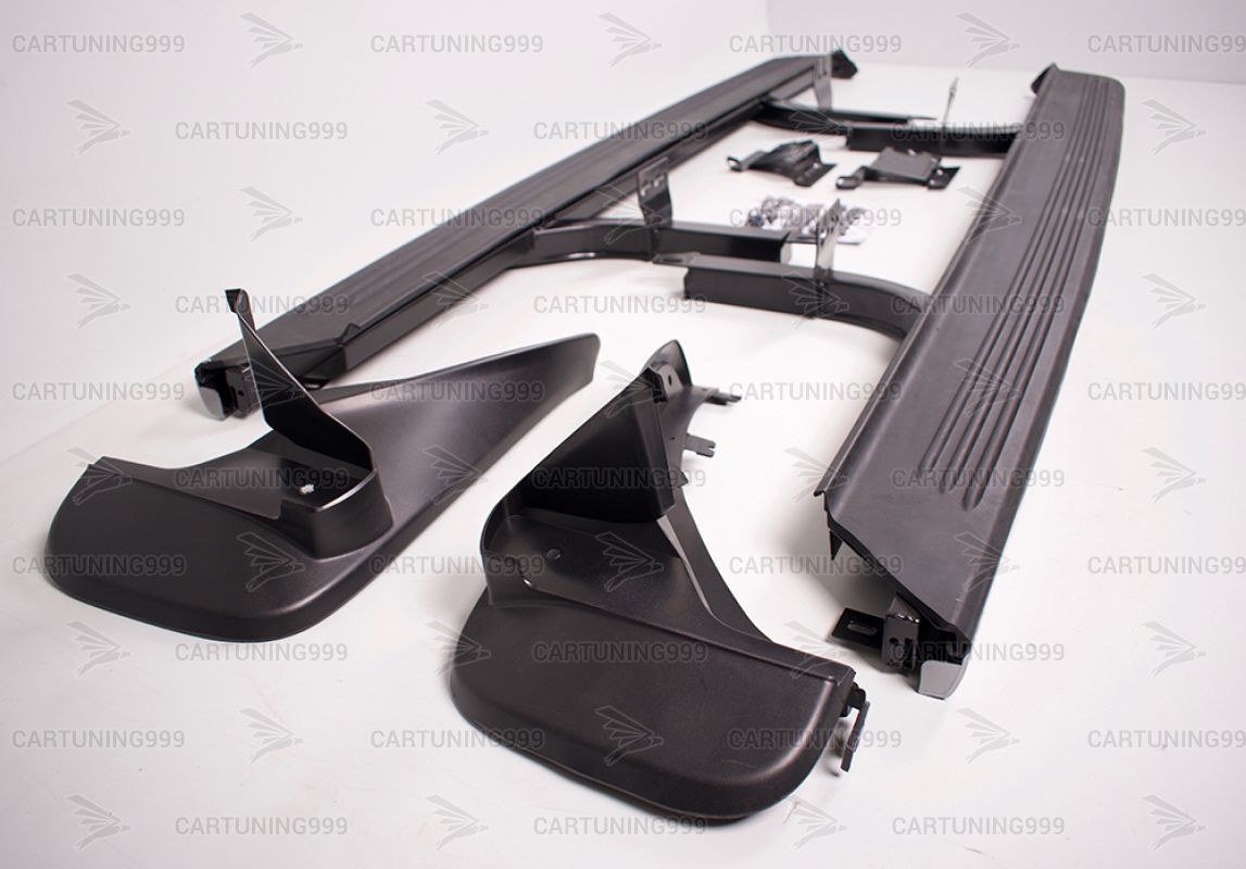 Пороги на Range Rover устанавливаются в штатные места без переделок и доработок. В комплект порогов входят: два порога левый правый, два передних брызговика, комплект крепежа.