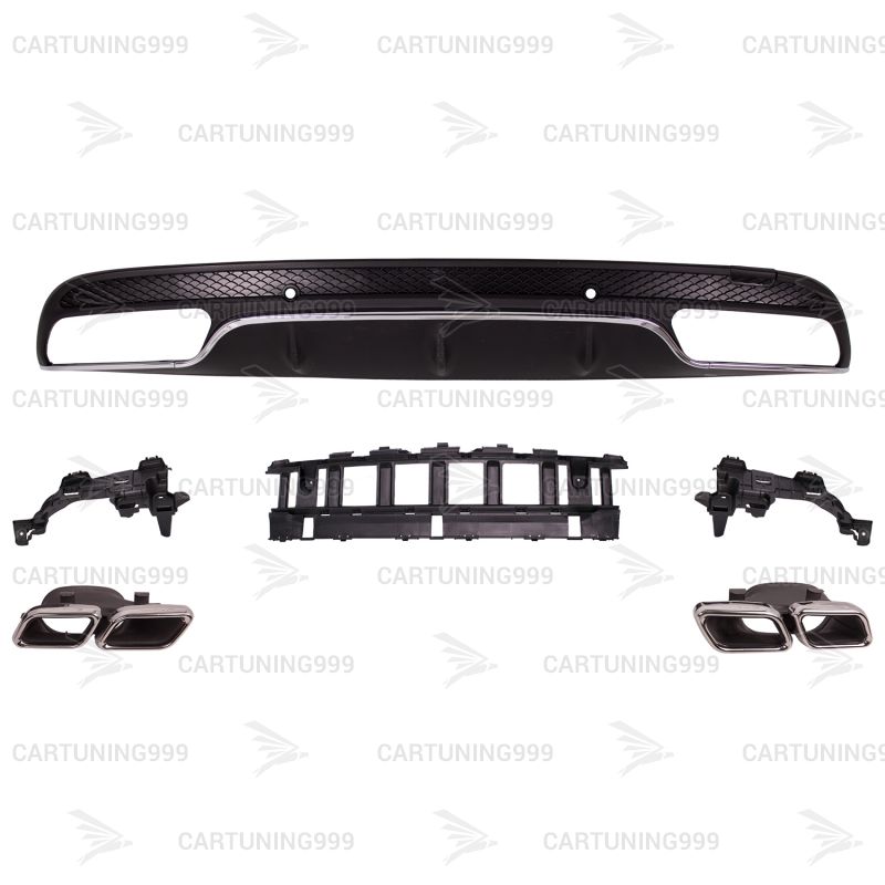 Диффузор и насадки 63 AMG Mercedes С-Сlass C 205 устанавливается на любой автомобиль C-klass в кузове W 205 в AMG пакете. В комплект входит диффузор с серебристой полосой, хромированные насадки на выхлопные трубы с гравировкой AMG и крепления для насадок.