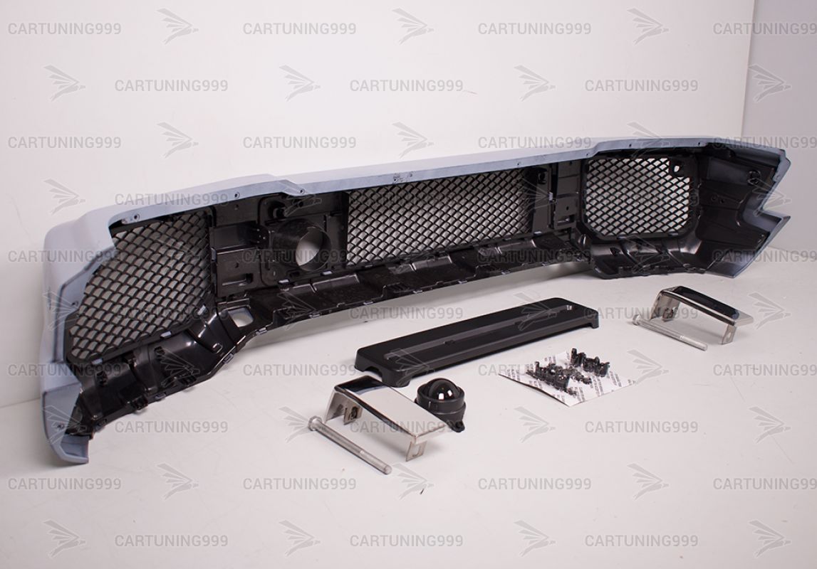 Передний бампер на Mercedes G-Class W 463 устанавливается в штатные места без переделок и доработок. В комплект бампера на гелендваген входит: облицовка бампера, клыки из нержавеющей стали, муляж дистроника соблюдения дистанции, подиум под номер, фальш парктроников, установочный крепеж. Бампер на Mercedes G463 поставляется под окрас.