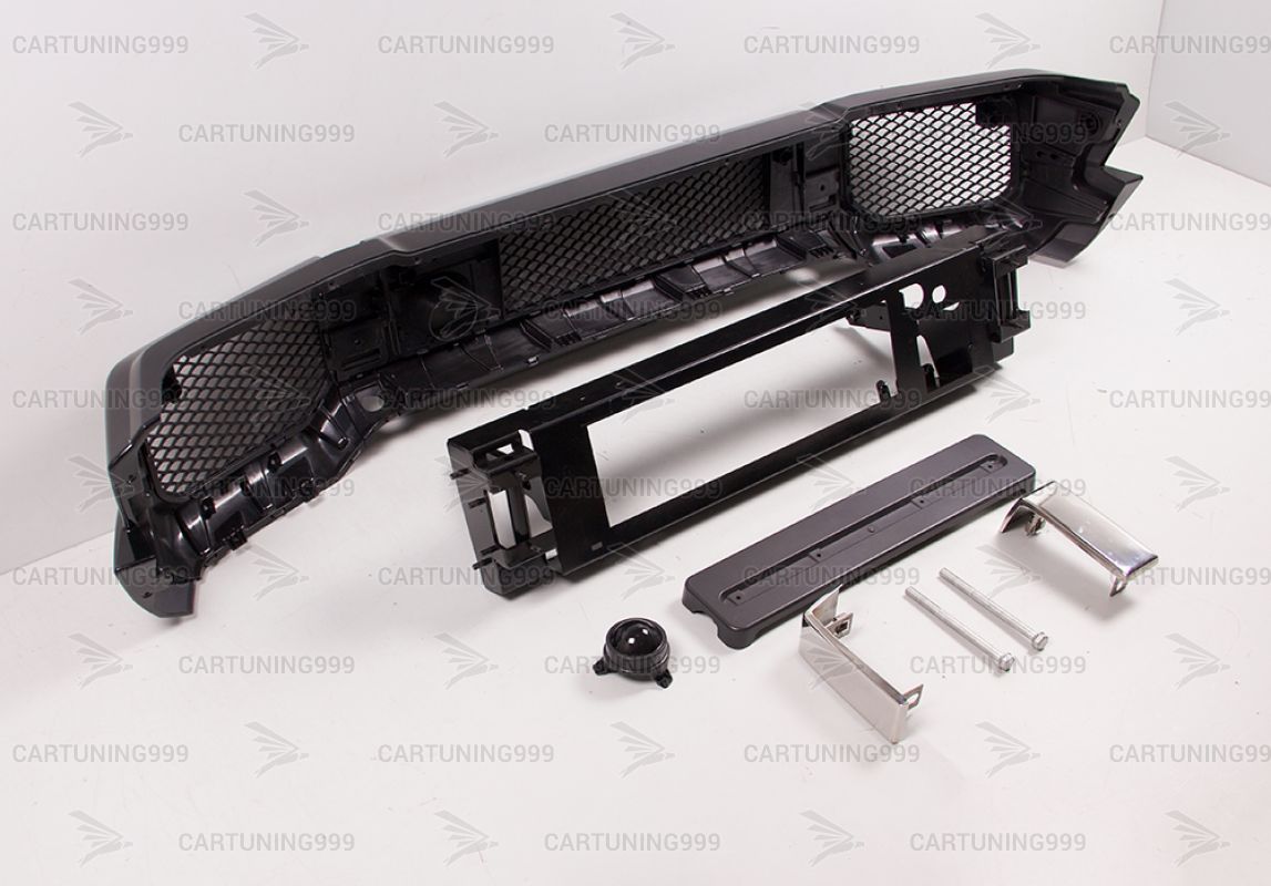 Передний черный бампер на Mercedes G-Class W 463 устанавливается в штатные места без переделок и доработок. В комплект бампера на гелендваген входит: облицовка бампера, клыки из нержавеющей стали, муляж дистроника соблюдения дистанции, подиум под номер, фальш парктроников, металический усилитель, установочный крепеж. Бампер на Mercedes G463 окрашен в черный 197 цвет.