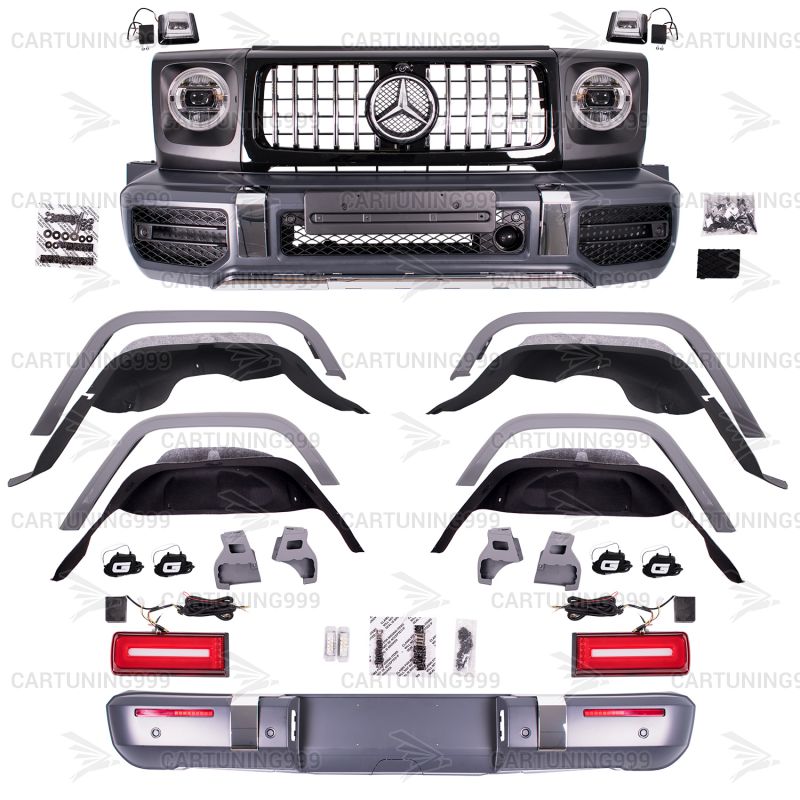 Комплект рестайлинга 63 AMG 2018 Mercedes G-Class W463 изготовлен из высококачественных материалов. В комплект входит: передний бампер, решетка радиатора, фары, очки на фары, поворотники на крылья, расширители колесных арок, законцовки порогов, задний бампер, задние фонари и комплект крепежа.