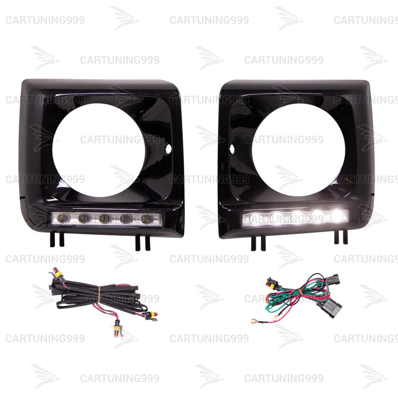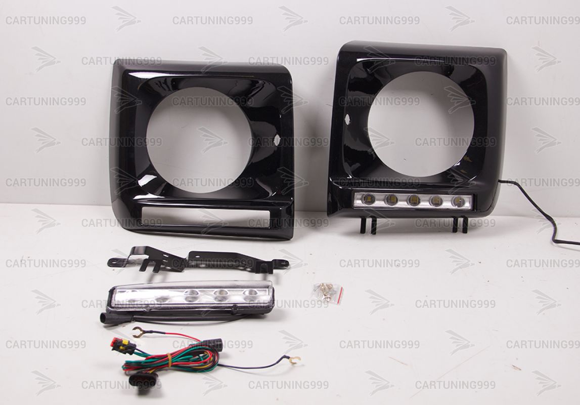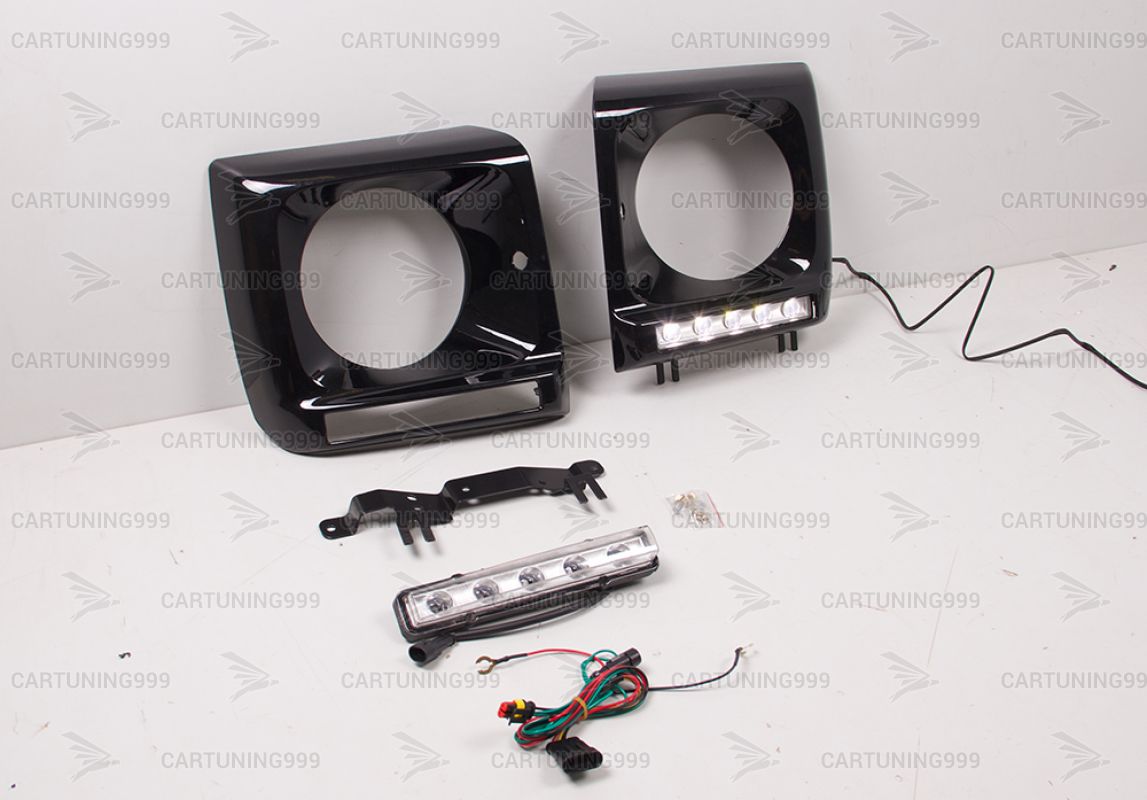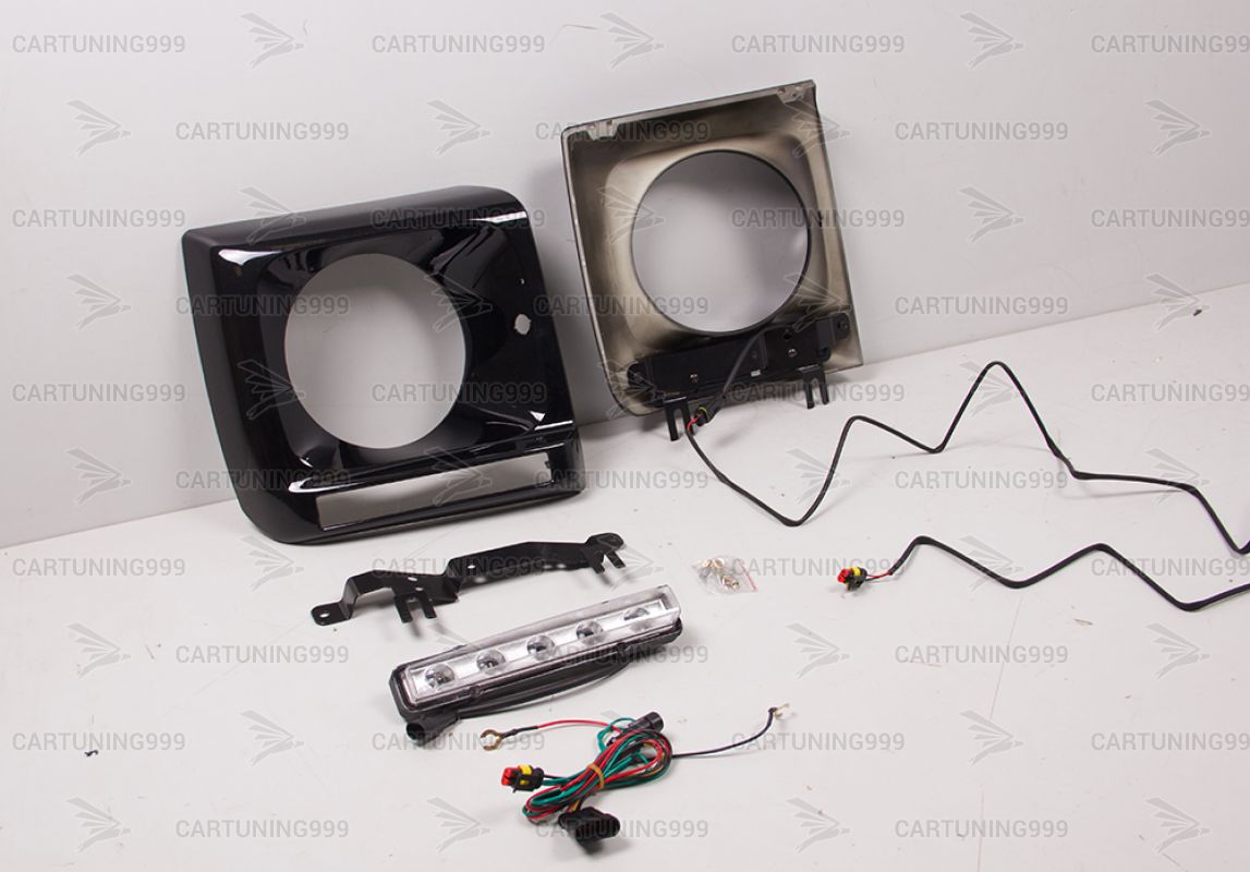 Черные маски фар на Mercedes G-Class W463 устанавливаются в штатные места без переделок и доработок. В комплект очков на гелендваген входит: маски фар, хромированные ходовые, кронштейны ходовых. Очки на Mercedes G463 окрашены в черный 197 цвет.