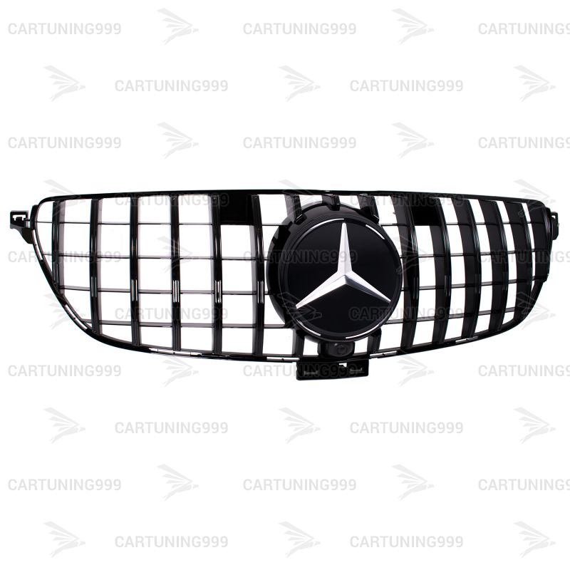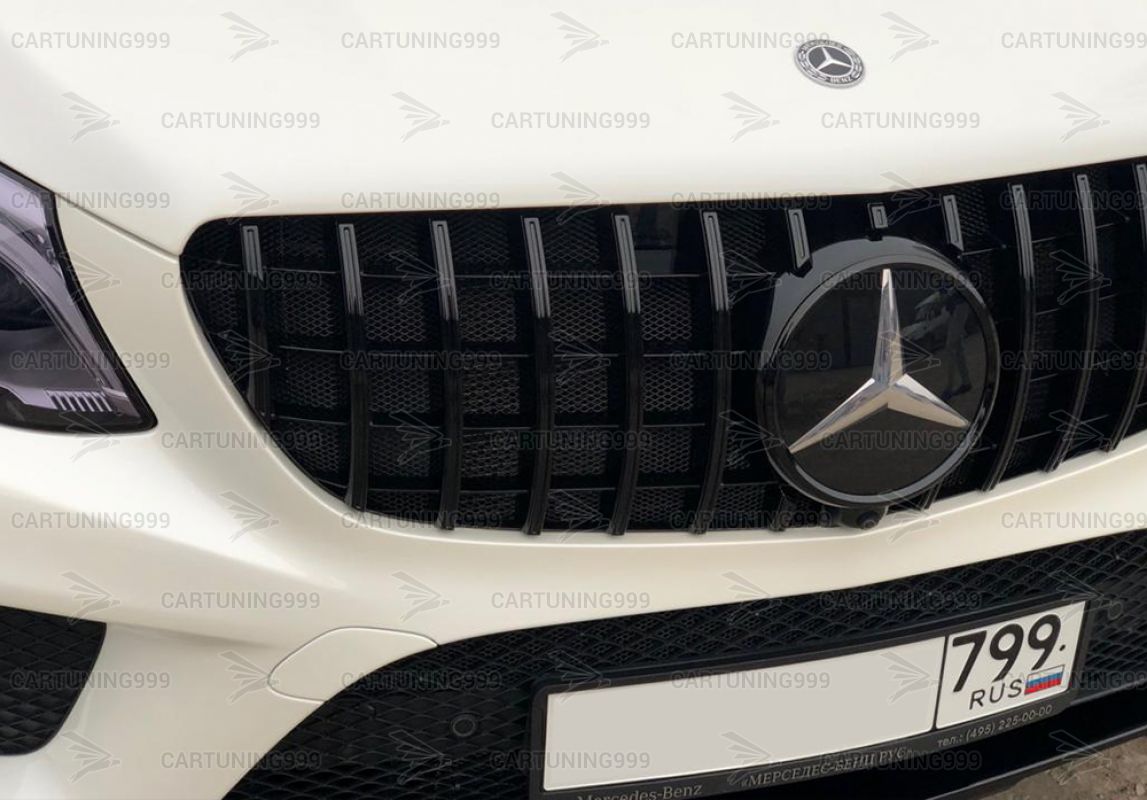 Черная решетка радиатора Panamericana Grille на Mercedes GLE Coupe С292 устанавливается в штатные места бампера. В комплекте решетка радиатора и эмблема звезда.