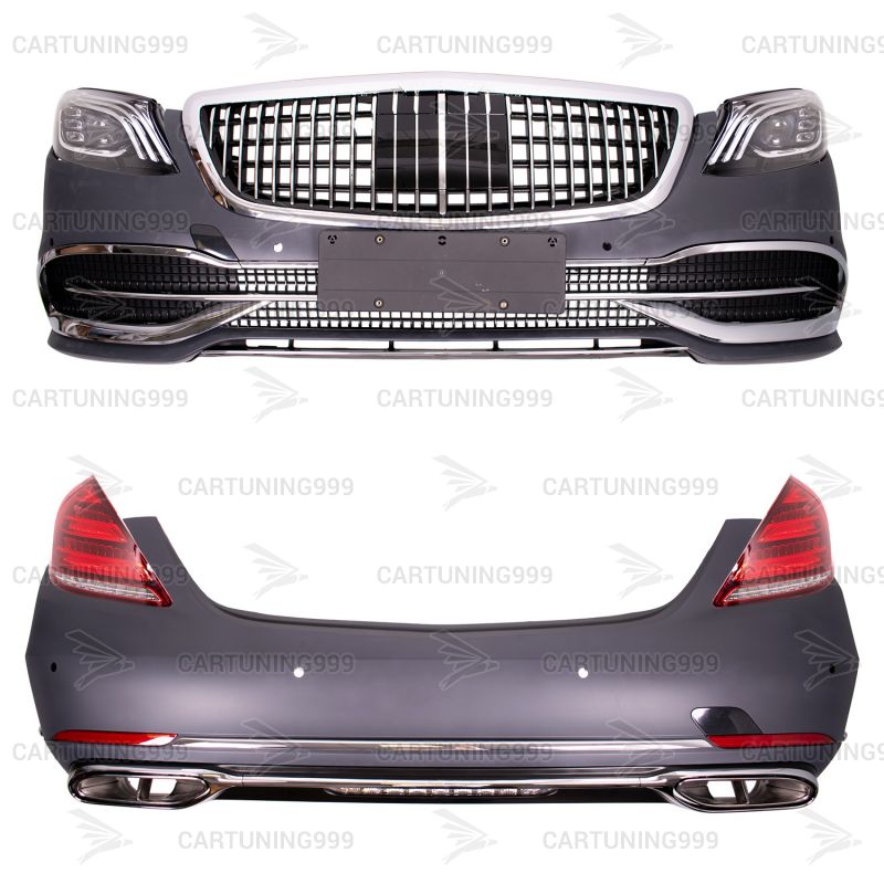 Комплект полного обвеса рестайлнинг Mercedes Maybach S-class X222 изготовлен из высококачественных материалов и устанавливается в штатные места без переделок и доработок. В комплект входит: передний бампер в сборе, решетка радиатора, передние фары, задний бампер в сборе, задние фонари, комплект хрома на стойки и комплект крепежа.