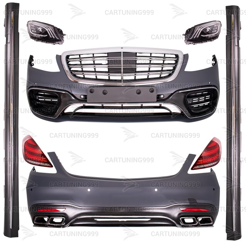 Обвес рестайлинг Mercedes S-class W222 изготовлен из высококачественных материалов и устанавливается в штатные места без переделок и доработок. В комплект обвеса на Mercedes W222 входит: передний бампер в сборе, передние фары, решетка радиатора, боковые пороги, задний бампер в сборе, насадки на выхлопные трубы с гравировкой AMG, задние фонари и комплект крепежа.
