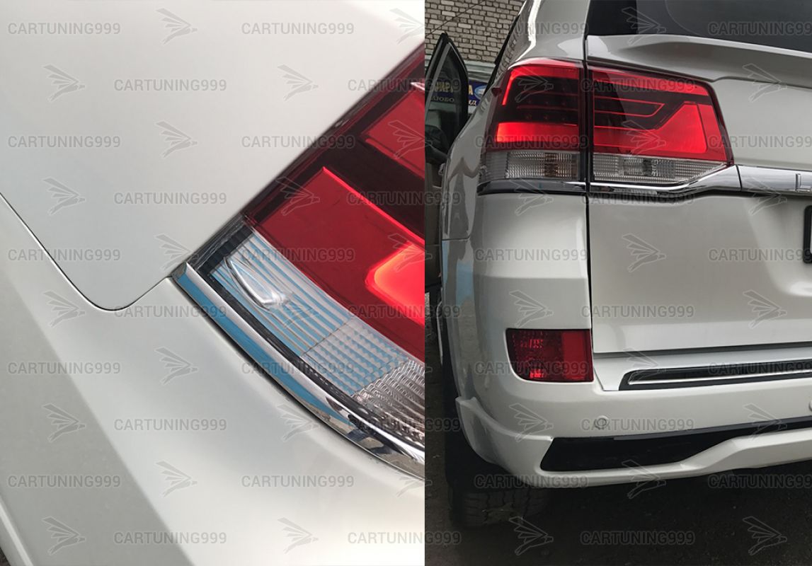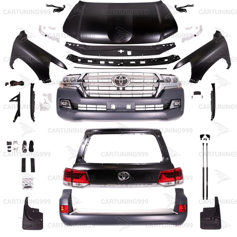 В комплект рестайлинга на Toyota Land Cruiser 200 входит: передний бампер в сборе с туманками, передние крылья, капот, петли капота, решетка радиатора, фары, крепления для фар, задняя крышка багажника, фонари, задний бампер в сборе с туманками и весь необходимый крепеж для монтажа.