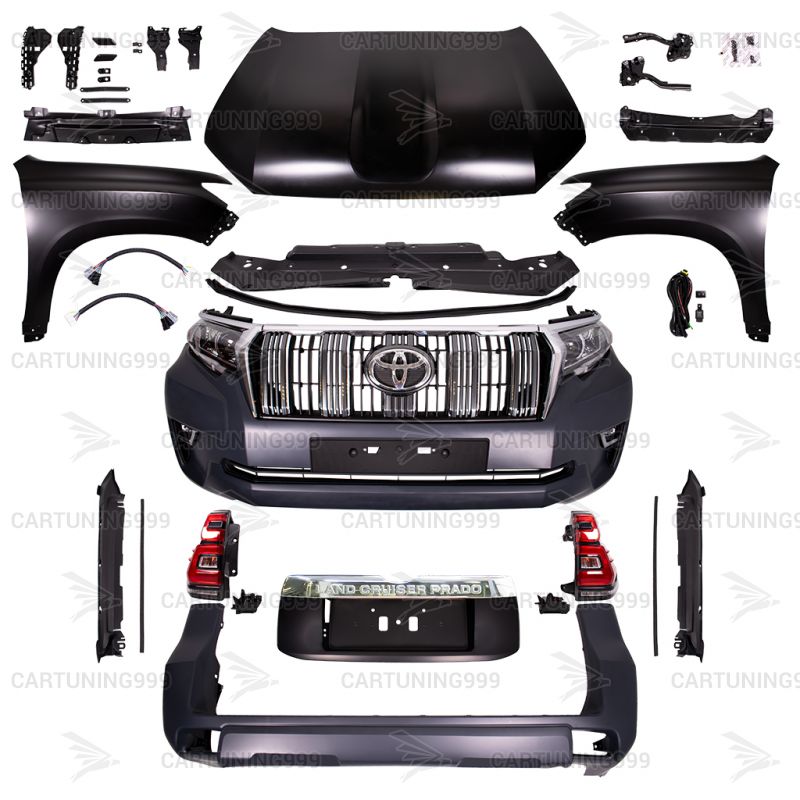 Рестайлинг 2017 для Toyota Land Cruiser Prado 150 изготовлен из высококачественных материалов. В комплект входит: передний бампер в сборе, передние крылья, капот, решетка радиатора, фары, задние фонари, задний бампер в сборе, весь необходимый крепеж для монтажа.